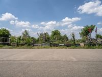 This is an image of a city landscape in Berlin, Germany. The photo captures a clear sky with cumulus clouds and a recreational area with open spaces, grass, and trees. The asphalt road surface runs through the residential area, surrounded by fields and plain landscapes. The image showcases the urban design and vegetation of the area, including the park and land lots. In the distance, there is an airport and an art district, adding to the diversity of the city. This photo represents the urban and natural elements of Berlin, highlighting its recreational and cultural offerings.