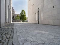 A modern residential area in Berlin, Germany, featuring a grey asphalt road surrounded by trees and clear skies. The urban design combines modern architecture with cobblestone, creating a unique cityscape.