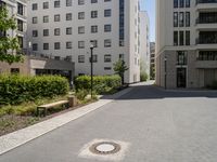 A modern high-rise condominium building in Berlin, Germany. The urban design and architecture blend seamlessly with the city life. Cobblestone roads and asphalt road surfaces contribute to the dynamic atmosphere. The residential area features lush grass and vegetation, with outdoor benches lining the streets.
