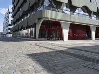 This is an image of a modern residential building in the city of Berlin, Germany. The architecture reflects the urban design and modernity of the city. The building is located in a mixed-use neighborhood, surrounded by other residential and office buildings. The clear sky above enhances the beauty of the architecture's facade. The road surface in front of the building is made of cobblestone, adding to the charm of the urban environment. This photo captures the vibrant city life and business district of Berlin, showcasing the dynamic and European charm of the city.