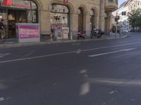 This image captures the bustling city of Berlin, Germany on a sunny day. The photo showcases a typical residential area with tree-lined streets and asphalt roads. The urban infrastructure, including buildings, storefronts, and curbs, reflect the unique urban design of the city. People can be seen going about their daily activities, with motorcycles and other modes of transport present. This is a vibrant scene that represents the dynamic and cosmopolitan nature of Berlin, making it a popular destination in Europe.