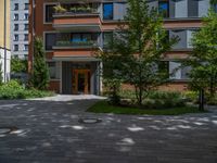 Modern architecture in a residential area of Berlin, Germany. Urban design with hard shadows and open spaces. City life under the European sun, showcasing the profile of urban surfaces.