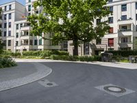 This is an image of a modern residential area in Berlin, Germany. The architecture showcases a combination of modern buildings and traditional cobblestone roads. The houses and properties are surrounded by open spaces and green grass. The image captures a sunny day with shadows cast by the trees and buildings. The urban design and infrastructure of the city are evident, with roads and road surfaces visible. This photo represents the vibrant city life and urban atmosphere of Berlin, a city known for its mixture of modern and historical architecture.