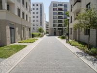 This is an image of a modern residential area in Berlin, Germany. The photo captures the straight road flanked by grass and trees, showing the urban design of the neighborhood. The buildings showcase a mix of modern architecture and traditional cobblestone streets. The clear sky above adds to the vibrant city life of Berlin. This photo represents the architectural beauty and urban lifestyle of Germany's capital city.