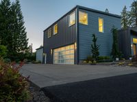 This image captures the beauty of a modern residential area in California, USA. The picture shows a yellow villa with large windows surrounded by lush green grass and vegetation. The residential property is located along a concrete street and features a driveway leading up to the house. The clear sky and dawn lighting create a peaceful atmosphere, highlighting the sleek design of the architecture. This photo represents the perfect blend of nature and modern living in California.