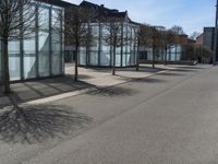 This is an image of a modern architecture building in Germany. The residential area is surrounded by trees, creating a natural ambiance in the urban setting. The clear sky and tints and shades of the facade add to the aesthetic appeal. The asphalt road surface and curbs are well-maintained, creating a smooth and comfortable environment for pedestrians. The street lights provide illumination during the night, ensuring safety. This photo represents the perfect blend of urban design and natural elements in a European city.