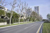 This image showcases the modern architecture and infrastructure found in a residential area of a bustling city. The clear sky above adds to the urban atmosphere. The photo captures a serene moment on an empty road, lined with trees and surrounded by office buildings and business districts. The well-maintained road surface and thoroughfare highlight the city's commitment to public spaces. This is a typical scene in a metropolitan area, where the balance between residential and commercial areas creates a vibrant cityscape.