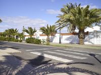 A picturesque residential area on the island of Fuerteventura. Classic architecture blends with palm trees and lush vegetation. The road lined with trees leads to charming houses in a peaceful neighborhood.