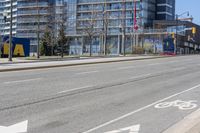 an empty street with white arrows painted on the ground next to a shopping mall in a city