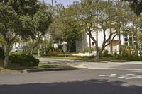 This is an image of a residential neighborhood in Los Angeles, California. The photo captures a clear sky over the suburban area, with houses and villas lining the streets. The architecture of the homes reflects the style and charm of the town. The road, made of asphalt, leads through the residential area and is surrounded by trees. This image represents the beauty and real estate offerings of this suburban neighborhood in Los Angeles. It is a perfect representation of urban living in Southern California.