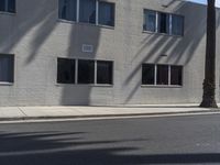 This image captures the essence of an urban scene in Los Angeles, California, USA. The photo shows a building with a grey facade and a line of windows made of composite material. The road surface is asphalt, lined with brick curbs. In the foreground, a fire hydrant stands on the sidewalk, surrounded by palm trees. The sun casts shadows on the street, creating a dynamic interplay of light and shadow. This photo represents a typical day in a residential area of Los Angeles, showcasing the unique urban design and materials used in the city.