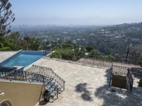 This is an image of a cityscape in Los Angeles, California, USA. The photo captures the iconic skyline of the city, featuring skyscrapers, residential buildings, and classic architecture. The view overlooks the residential area, with homes, houses, and properties nestled among the mountains. The image showcases the open spaces, nature, and trees surrounding the high-rise buildings. In the foreground, there is a swimming pool with a paver surface. The clear sky and elevated perspective provide an overview of the city's urban design. This photo represents the vibrant and recreational atmosphere of Los Angeles.