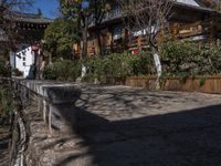 This image captures the architectural beauty of a historic neighborhood in Lijiang, Yunnan, China. The clear spring day illuminates the cobblestone road lined with low-rise residential buildings and charming houses. The old town's classic architecture provides a picturesque backdrop for the lush vegetation and trees in the foreground. The bridge over the river adds to the charm and reflects the town's tourism appeal. Shangri-La's serene atmosphere is embodied in this scene, with its iconic hard shadows and clear skies. Explore the old village and immerse yourself in the rich cultural heritage of this captivating destination.