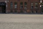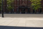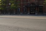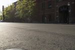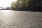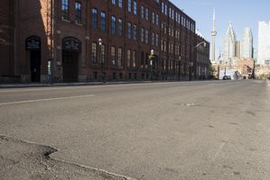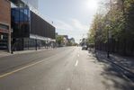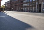 A straight road in a residential area of a metropolitan city. Buildings line the road, creating a brick wall effect. Clear skies and sunshine cast hard shadows on the asphalt road surface.