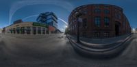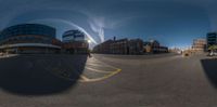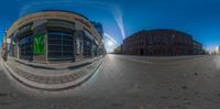 a view of a road and buildings from a fish eye lens lens as seen from the street