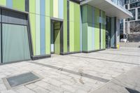 This is an image of a modern residential building in Toronto, Canada. The glass walls and green walls enhance the urban design of the city. The concrete surface of the road and the green vegetation create a vibrant atmosphere. The building has a unique facade with large windows and a shade-covered entrance. The city life is reflected in the busy road and the fixtures along the curb. This photo captures the essence of urban architecture and the modern lifestyle in Toronto, Ontario.