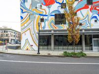 A vibrant cityscape in Portland, Oregon. Colorful graffiti walls line the streets of the urban art district. Office buildings and cafes create a bustling city atmosphere. The city's urban design and residential areas offer a unique blend of art and business.