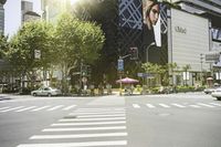 This image captures the vibrant urban landscape of Shanghai, China. The modern architecture of the city is showcased by the tall residential buildings and stylish storefronts. The wide, open spaces include well-designed pedestrian lanes and crosswalks, with yellow lines marking the way. The tree-lined streets add a touch of greenery to the busy cityscape. With its mix of architectural beauty and functional infrastructure, this photo represents a typical day in the lively neighborhoods of Shanghai, Asia.