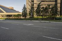 Empty street in Toronto at dawn, surrounded by modern architecture. Clear sky highlights the yellow lines on the road surface. Pedestrians pause in a quiet residential area, taking in the break of day.