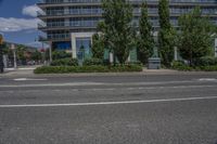 a black paved street with a tall building in the background near some trees and bushes