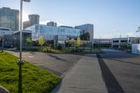 This is an image of a modern architecture building in the business district of Toronto, Canada. The photo captures the vibrant urban design with busy thoroughfares and streets lined with office buildings and condominiums. The cityscape showcases the combination of concrete surfaces, asphalt roads, and open spaces with trees and vegetation. Street lights illuminate the evening scene, creating a dynamic atmosphere in this bustling neighborhood. This image represents the blend of residential and commercial properties, as well as the public spaces and land lots that define the urban landscape of Toronto.