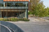 This image captures the urban design of a suburban area in Toronto, Canada. The property features a large building with two trees in front, surrounded by a fenced-off area. The road surface and curb highlight the elevated and high-end nature of the neighborhood. A clear blue sky with clouds creates a pleasant backdrop for the scene. The trees cast hard shadows, adding depth and contrast to the image. This photo represents a typical day in the suburban areas of Toronto, showcasing the open spaces and residential properties in the region.
