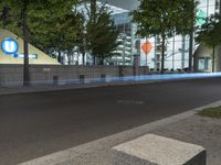 Urban design in a residential area with tree-lined roads and buildings. The asphalt road surfaces, curbs, and tinted windows add a touch of modernity to the scene. Lush vegetation surrounds the thoroughfares.