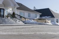 This is an image of a residential area in Ontario, Canada. The photograph captures the architecture of the houses, highlighting the siding, walls, and roofs. The road, made of asphalt and concrete, leads to the houses with clear curbs and driveways. In the winter, the area is covered in snow, creating a picturesque scene. The trees surrounding the neighborhood add to the beauty of the landscape. This photo represents a typical day in a Canadian residential area during winter.
