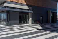 an empty brick building with a large glass door and a bicycle in the corner of it
