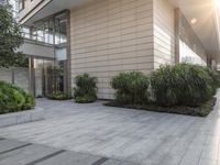 This is an image of a modern architecture building in the business district of Shenzhen, China. The tall building is surrounded by a well-maintained sidewalk with a couple of bushes in the middle. The residential and commercial properties in the area have a sleek and low-profile design. The cityscape represents the urban landscape of Shenzhen, a bustling business hub in Guangdong, China. The image showcases the modern architecture and real estate development in this area of Asia.