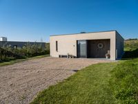 This is an image of a modern residential area in Holland, Netherlands. The landscape features open spaces with grass and trees, surrounded by residential buildings with modern architecture. The clear sky above highlights the facade of the buildings, with windows and doors visible. The road surfaces are made of asphalt and gravel, providing access to the houses and villas in the area. This photo represents a typical day in a residential neighborhood in Holland, showcasing the combination of natural vegetation and modern infrastructure.