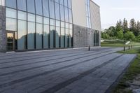 A modern architecture building in Toronto's business district. The glass facade reflects the break of day, creating a stunning visual effect. The spacious open space and walkways enhance the urban design of the area.