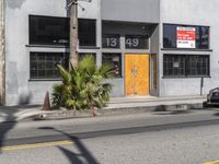 This is an image of a modern residential building in Los Angeles, California. The architecture features a yellow facade and leafy trees lining the road. The vibrant city life is apparent in the storefronts and shops along Abbot Kinney Boulevard in Venice Beach. The urban design and infrastructure, including the asphalt road and curbs, contribute to the suburban feel of the neighborhood. This photo represents a sunny day in Los Angeles, showcasing the unique blend of modern architecture, city living, and shopping opportunities.