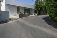 A stunning modern residential building located in the beautiful city of Los Angeles, California, USA. The architecture is characterized by low concrete structures, with a well-paved asphalt road leading straight down the road. This residential area is known for its modern homes and properties, offering a desirable living environment. The clear sky above highlights the beauty of the building and the surrounding Hollywood Hills. The well-maintained infrastructure includes road surfaces, lanes, and a parking garage with a driveway covered in tar.