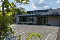 This image showcases a modern residential building in Toronto, Canada. The architecture of the building features clean lines and large windows, allowing for plenty of natural light. Surrounding the building are trees and vegetation, creating a serene environment. In the foreground, there is a parking lot surface with parked cars, indicating the busy nature of the urban area. This building is located in the business district of Toronto and could potentially serve as an office building or a museum. Overall, this photo captures the blend of modern architecture and natural elements in the city of Toronto.