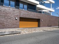 This is an image of a modern residential building in Bremen, Germany. The architecture combines brick, wood, and composite materials to create a unique design. The building is located in a residential area, with trees and a clear sky in the background. The road in front is made of asphalt, with a brick driveway leading to the entry. The image captures the urban design and city life of Bremen. This photo represents a typical day in the city, showcasing the modern architecture and urban landscape of Europe.