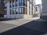 This stock photo showcases a beautiful residential building located in the urban neighborhood of Berlin, Germany. The modern architecture of the building stands tall against the city skyline. The building is situated on the side of a street with a cobblestone walkway on one side. The day is bright, highlighting the sleek facade and lines of the structure. The surrounding infrastructure, road surface, and shadows add to the overall urban design of the area. It perfectly captures the essence of city life in Berlin's bustling residential area. Ideal for illustrating the concepts of urban living, property, home, and business in Europe's vibrant business district.