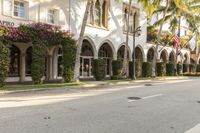 A classic architecture building in a residential area, surrounded by palm trees. The tree-lined road leads to a suburban neighborhood. This old town property is perfect for a hotel in a beach town.