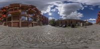A charming residential courtyard in Berlin, Germany, showcasing modern architecture against a backdrop of historic brick walls and cobblestone roads. Multicolored houses and hard shadows create a unique urban design.