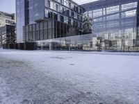 A high-rise building with a sleek facade stands tall in a bustling urban area. Its large windows offer views of the surrounding city. This modern condominium and office building is located in a vibrant residential area.
