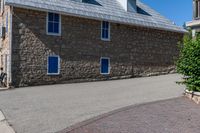 This brick and stone building in Toronto, Canada is a beautiful residential home with an arched window. The house is shinning under the clear sky on a sunny day in the suburban area of Toronto. The surface around the home is made of asphalt, adding to the charm of this suburban neighborhood.