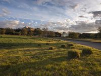 A picturesque California dawn with a modern residential home surrounded by lush green grass and towering trees. The curving road leads into the wilderness, with contrails dotting the sunrise sky.