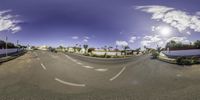 a panoramic lens shot of an intersection with some white fences and buildings in the background
