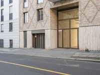 A classic brick building in Berlin, Germany. The modern architecture stands out in the residential neighborhood. The woman on her motorcycle adds to the lively city life. No parking at the entrance.