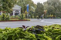 a woman walking across the street next to plants and trees along with a person on a bike behind her