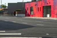 This image captures the urban landscape of a residential area in Los Angeles. The architecture and design of the houses reflect the urban and suburban character of the city. The road surface and asphalt lanes lead through the neighborhood, with a crosswalk and zebra crossing providing pedestrian access. The vibrant red color of graffiti on a wall adds an artistic touch to the scene, as it is located in an art district. This photo showcases the dynamic city life and urban design that Los Angeles is known for.