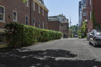 A classic brick building in a residential area of Toronto, Canada. Straight road lined with vehicles and hedges. Clear sky highlights the timeless beauty of this urban neighborhood.