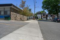 This is an image of a clear sky above a residential area with suburban houses. In the foreground, there is a road and driveway made of asphalt, leading to a parking lot. The surface of the road and parking lot is smooth and well-maintained. This photo represents a typical sunny day in a suburban neighborhood, showing the entryway to the residential area. The blue sky adds a sense of openness and brightness to the scene.