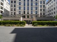 This image showcases the modern architecture of a residential building in Berlin, Germany. The building is located in a vibrant neighborhood with lush vegetation and tree-lined streets. The clear sky highlights the sleek facade and the large windows of the building. The road surface is made of cobblestone, adding to the urban design. The photo captures the essence of city life in Berlin, with its high-rise condominiums and office buildings. The image reflects the harmonious blend of modern architecture and natural elements in this European city.