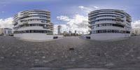 Snapshot of Berlin's modern architecture and urban design. Two circular sculptures displayed on the pavement in a residential area. Clear sky and straight road create a striking cityscape. A glimpse into Berlin's vibrant city life.